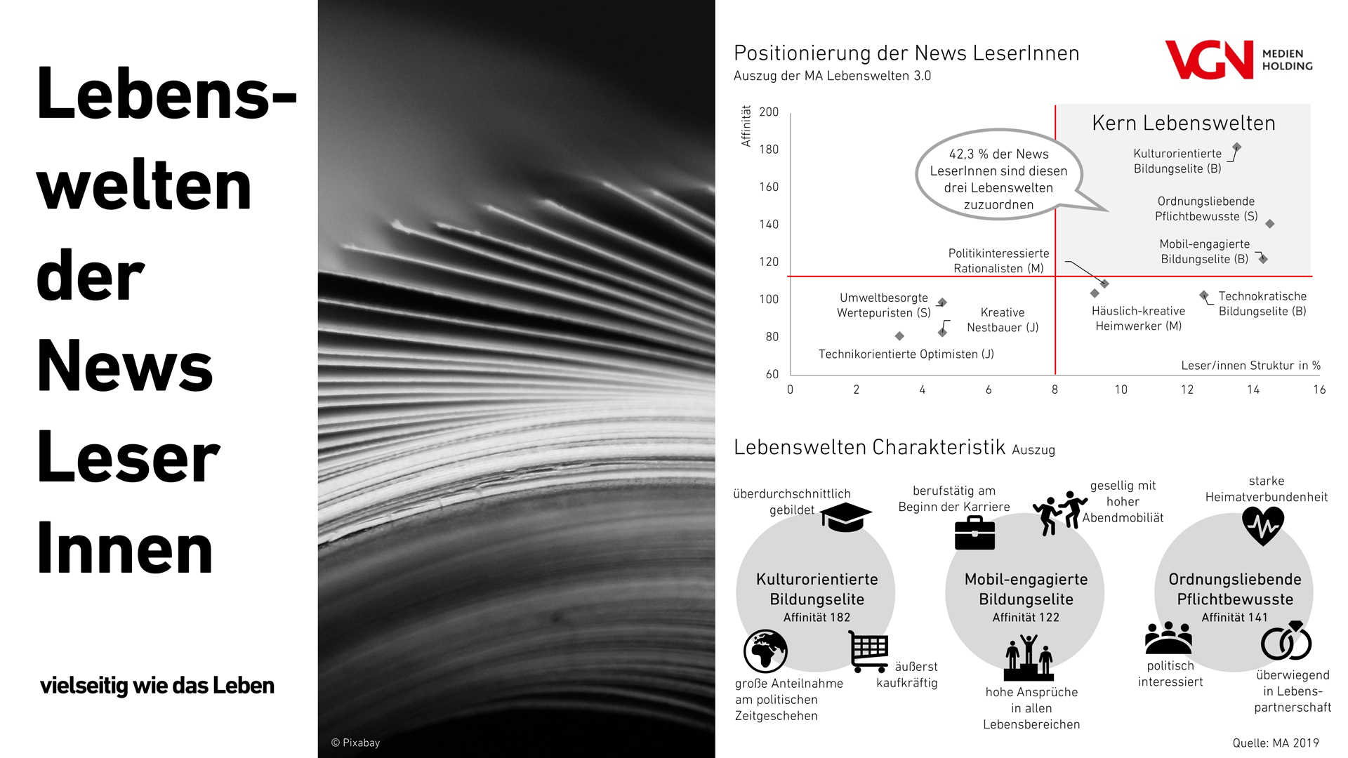 Die News-LeserInnen präsentieren sich sehr vielseitig: Neben den insgesamt 15 formulierten Lebenswelten treten vor allem drei Segmente in den Vordergrund, deutlich überdurchschnittlich im Vergleich zu einer österreichischen Wohnbevölkerung 14+: mobil engagierte sowie kulturorientierte Bildungselite und ordnungsliebende Pflichtbewusste. 42,3 % der News-LeserInnen sind diesen drei Lebenswelten zuzuordnen. Zum Vergleich: 29,4 % der österreichischen Wohnbevölkerung 14+ finden sich in diesen drei Lebenswelten wieder.