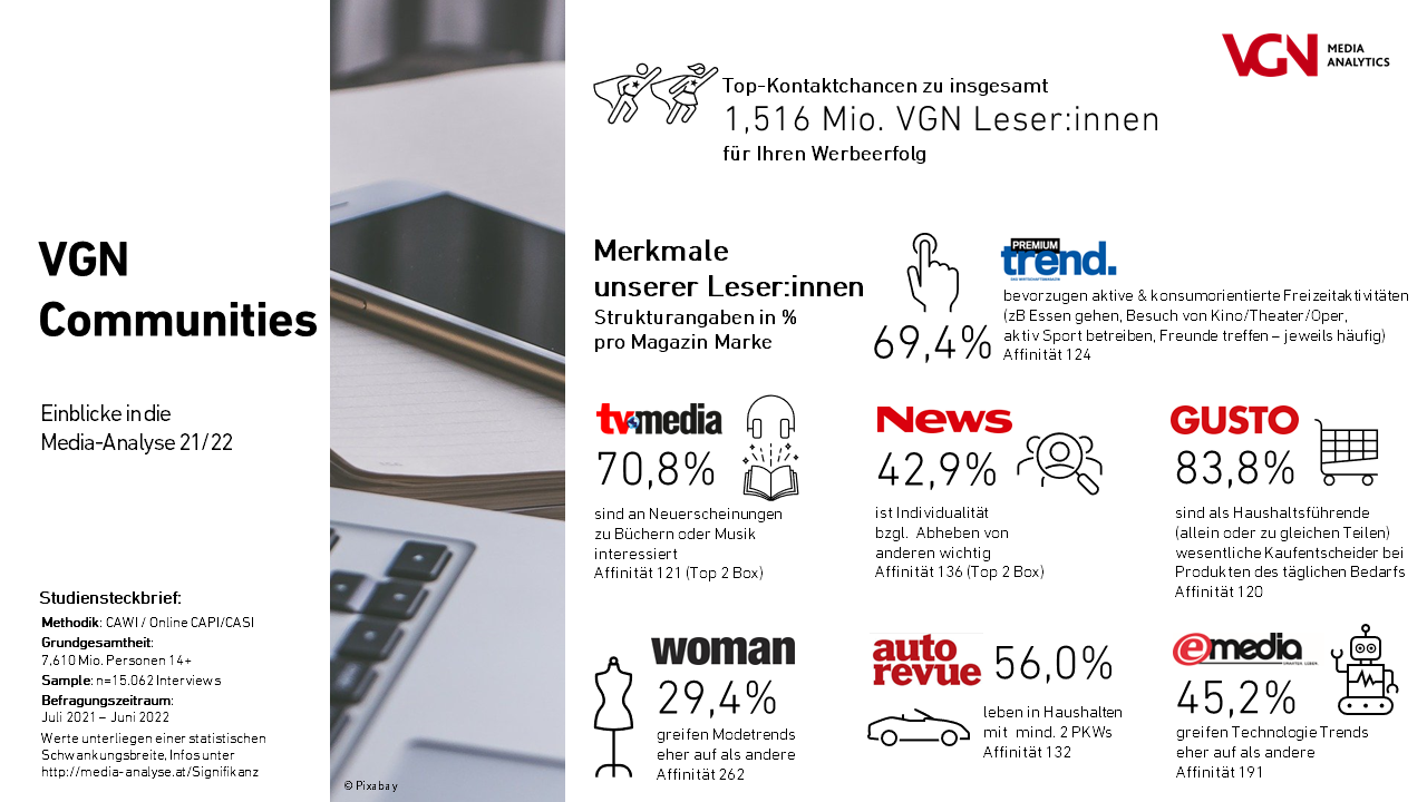 Einen Auszug zu einigen Topmerkmalen der VGN-Leser:innen haben wir auf Basis der MA 21/22 in einer Infografik für Sie zusammengestellt.