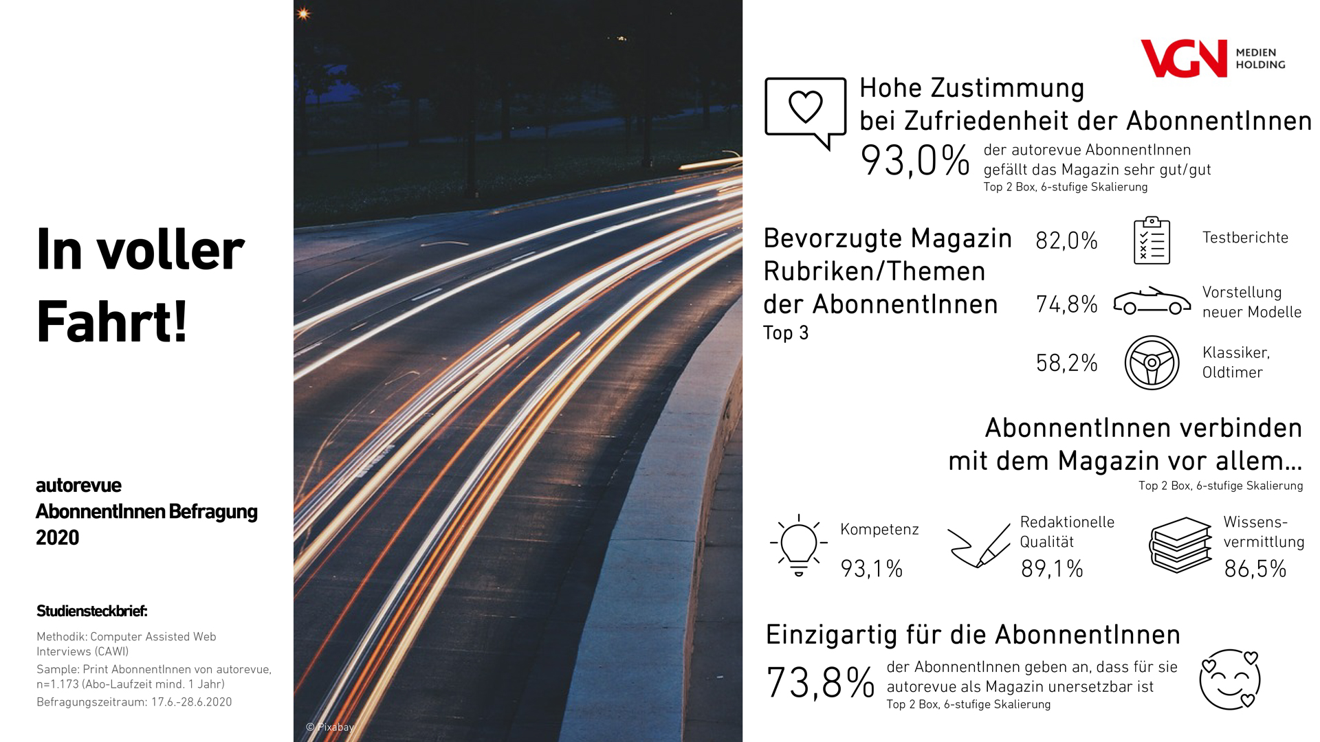 Die Meinungen unserer AbonnentInnen sind ein wesentlicher Input für die Weiterentwicklung unserer VGN-Medienmarken. So bitten wir unsere AbonnentInnen in regelmäßigen Intervallen um Feedback zu den jeweiligen Magazinen. Von der Qualität dieser Abonnentenbeziehung profitiert in weiterer Folge auch der Werbemarkt. Für die Kommunikationsbotschaften der werbetreibenden Unternehmen eröffnet sich ein Medienmarken-Portfolio mit enger Beziehung zu ihren LeserInnen. Dies wiederum lässt auf eine hohe Bindung und eine intensive Nutzung schließen. Bei der Autorevue-Abonnentenbefragung 2020 kann sich unser Medienhaus über die hohe Zustimmung bei der Zufriedenheit freuen: So geben 93,0 % der Autorevue-Print-AbonnentInnen an, dass ihnen das Magazin sehr gut/gut gefällt.