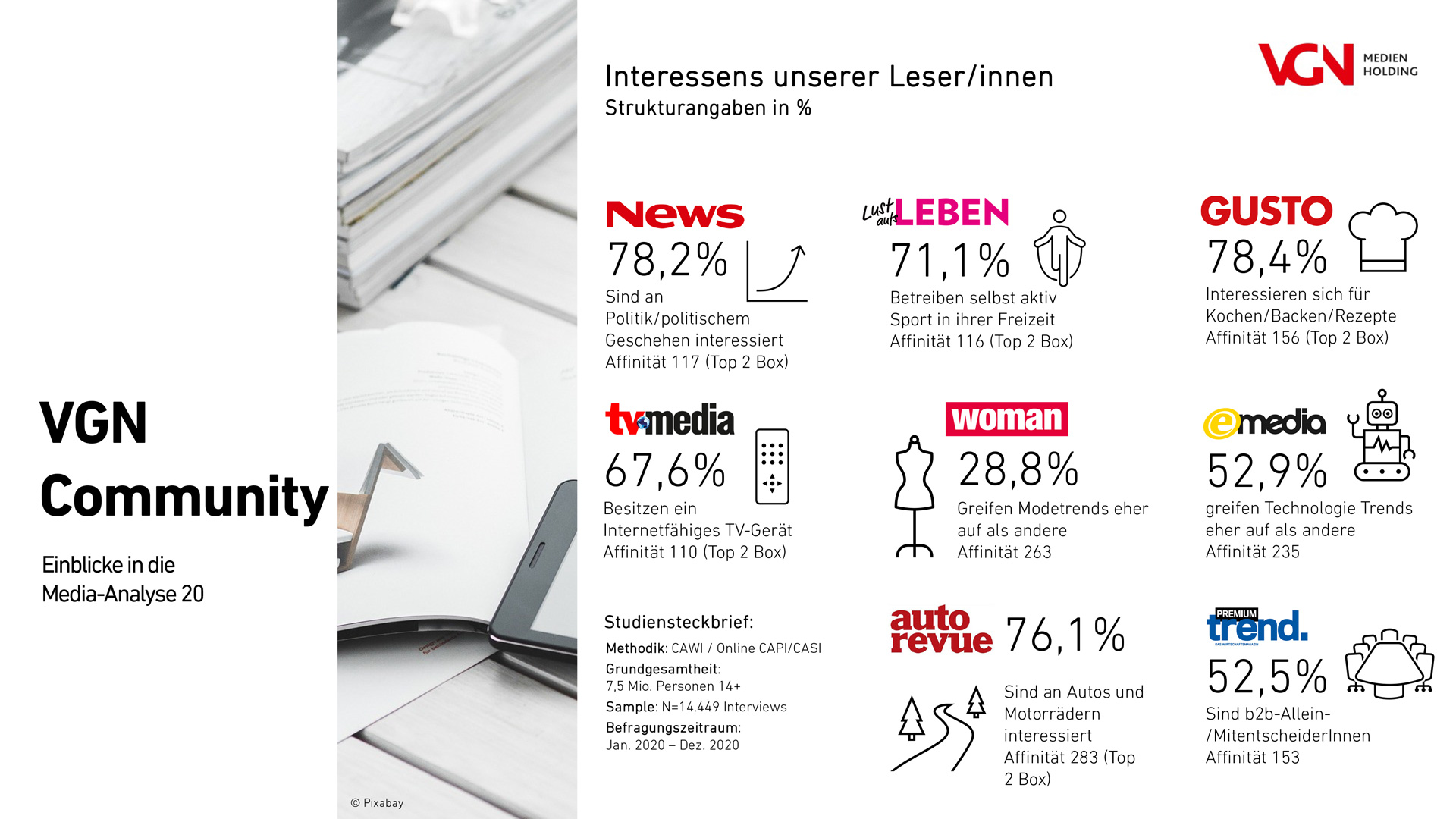 Volle Magazinpower bietet die VGN-Kombi, bestehend aus dem ausgewiesenen Magazinportfolio mit News, TV-MEDIA, WOMAN, e-media, autorevue, GUSTO, Lust aufs LEBEN und trend.PREMIUM. So kann die VGN-Kombi auf insgesamt 1,6 Millionen* LeserInnen verweisen.