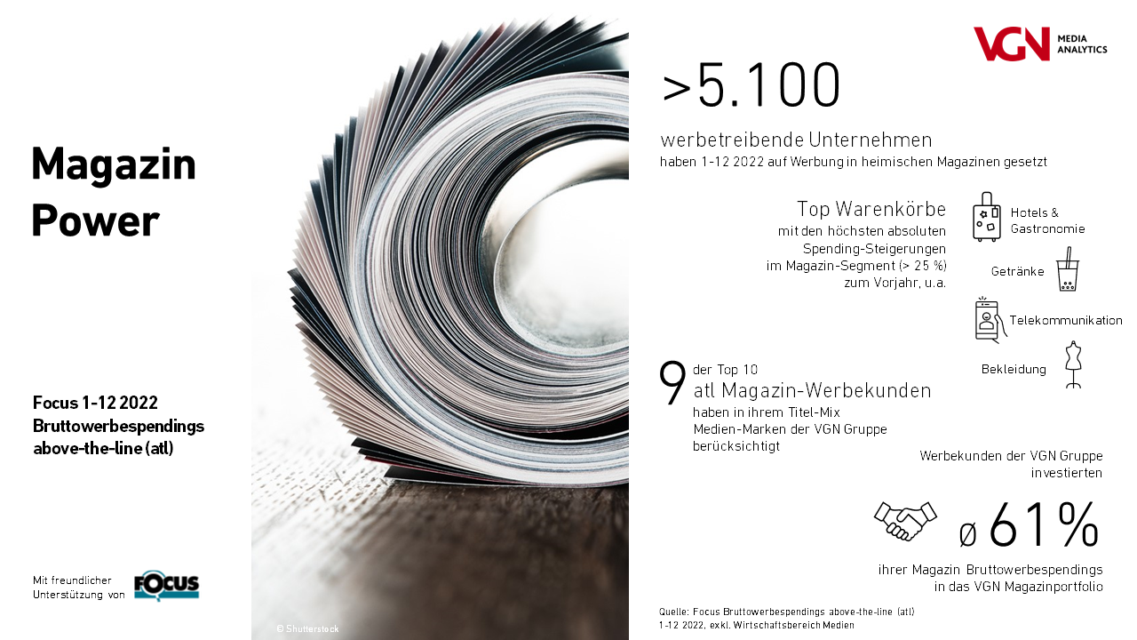 Das Titelportfolio der VGN-Gruppe bietet für magazinbuchende Werbekunden zahlreiche Kontaktchancen zu spannenden Communitys innerhalb einer breiten Themenpalette. So haben 2022 neun der Top Ten der Above-the-Line-Magazin-Werbekunden in ihrem Titelmix Medienmarken der VGN-Gruppe berücksichtigt. Die Werbekunden der VGN-Gruppe haben 2022 im Schnitt 61 % ihres Magazin-Bruttowerbebudgets in das VGN-Magazinportfolio investiert.