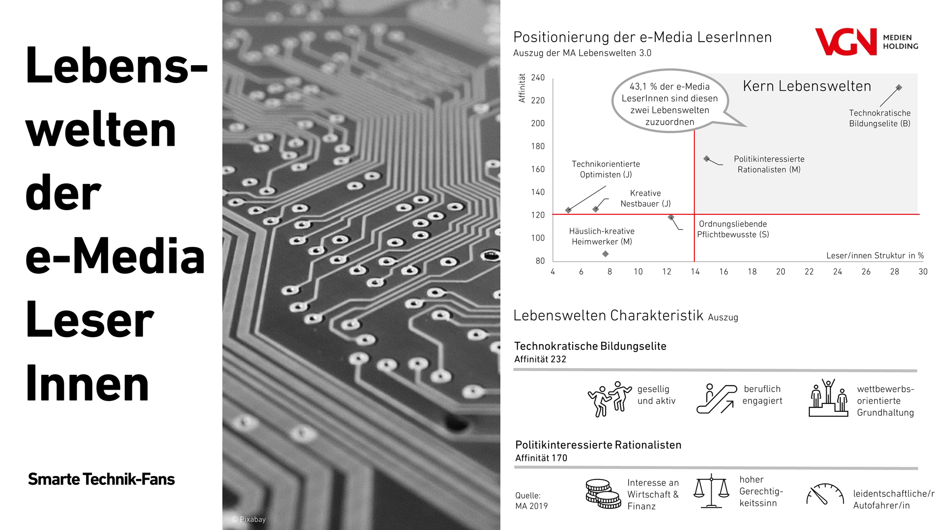 Rund 43 % der e-media-LeserInnen lassen sich diesen beiden Lebenswelten zuordnen, die im Vergleich zur österreichischen Wohnbevölkerung (14+) mit einer Affinität von 232 bzw. 170 innerhalb der e-media-Leserschaft deutlich überdurchschnittlich ausgeprägt sind.
