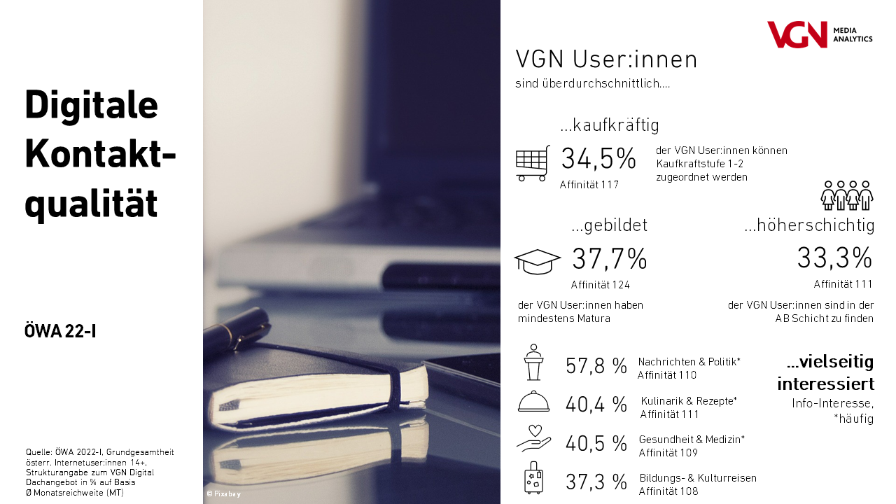 Ein Blick auf die Struktur der User:innen der VGN Medien Holding zeigt eine tendenziell überdurchschnittliche Ausprägung bei durchschnittlicher Kaufkraftstufe 1–2, Schicht AB, höherem Bildungslevel ab Matura bzw. beim persönlichen Nettoeinkommen von mindestens € 3.000,– im Vergleich zu österreichischen Internetuser:innen 14+ im Allgemeinen.