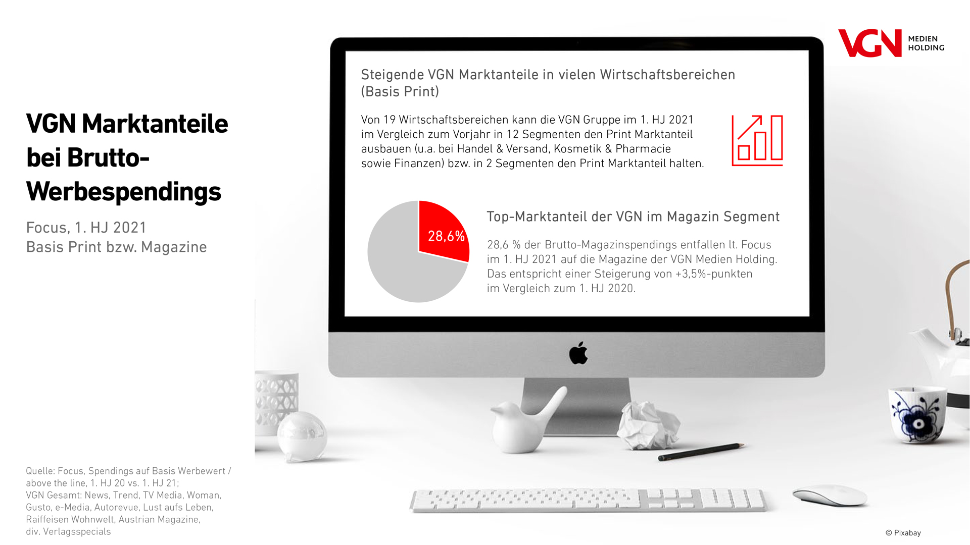 Mit Blick auf die Focus-Brutto-Spendings des ersten Halbjahrs 2021 kann die VGN Medien Holding dennoch ein erfreuliches Ergebnis verzeichnen: So kann das Magazinportfolio der VGN-Gruppe im Vergleich zum ersten Halbjahr 2020 ein Plus von 3,5 Prozentpunkten beim Magazinmarktanteil verbuchen. Mit einem Marktanteil von 28,6 % zählt die VGN Medien Holding zu den führenden Medienhäusern im Magazinsegment hinsichtlich Brutto-Werbespendings.