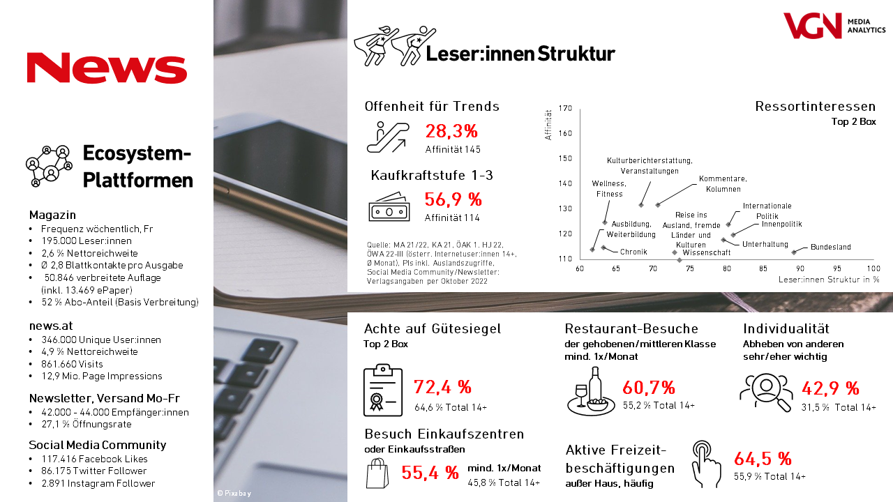 Einen Auszug mit einigen Topmerkmalen der News-Leser:innen auf Basis der MA 21/22 sowie einen Auszug der News-Ecosystem-Plattformen haben wir für Sie in einer Infografik zusammengestellt.